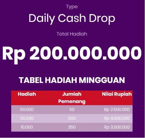 4. Setiap hadiah akan diberikan hingga Rp 50.000; Rp 20.000; Rp 10.000. Sebanyak 12.000 hadiah tunai senilai total Rp 200.000.000 akan diberikan secara acak kepada pemain yang beruntung.