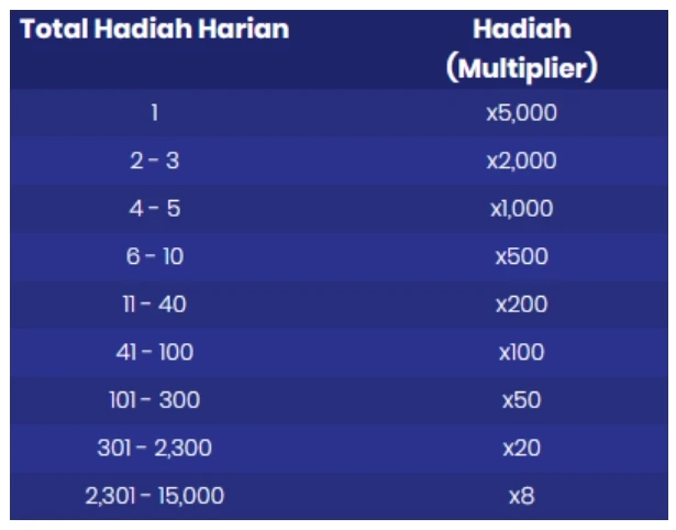 7. Pemain akan memenangkan hadiah berupa multiplier dari jumlah taruhan seperti yang tertera di Tabel hadiah.